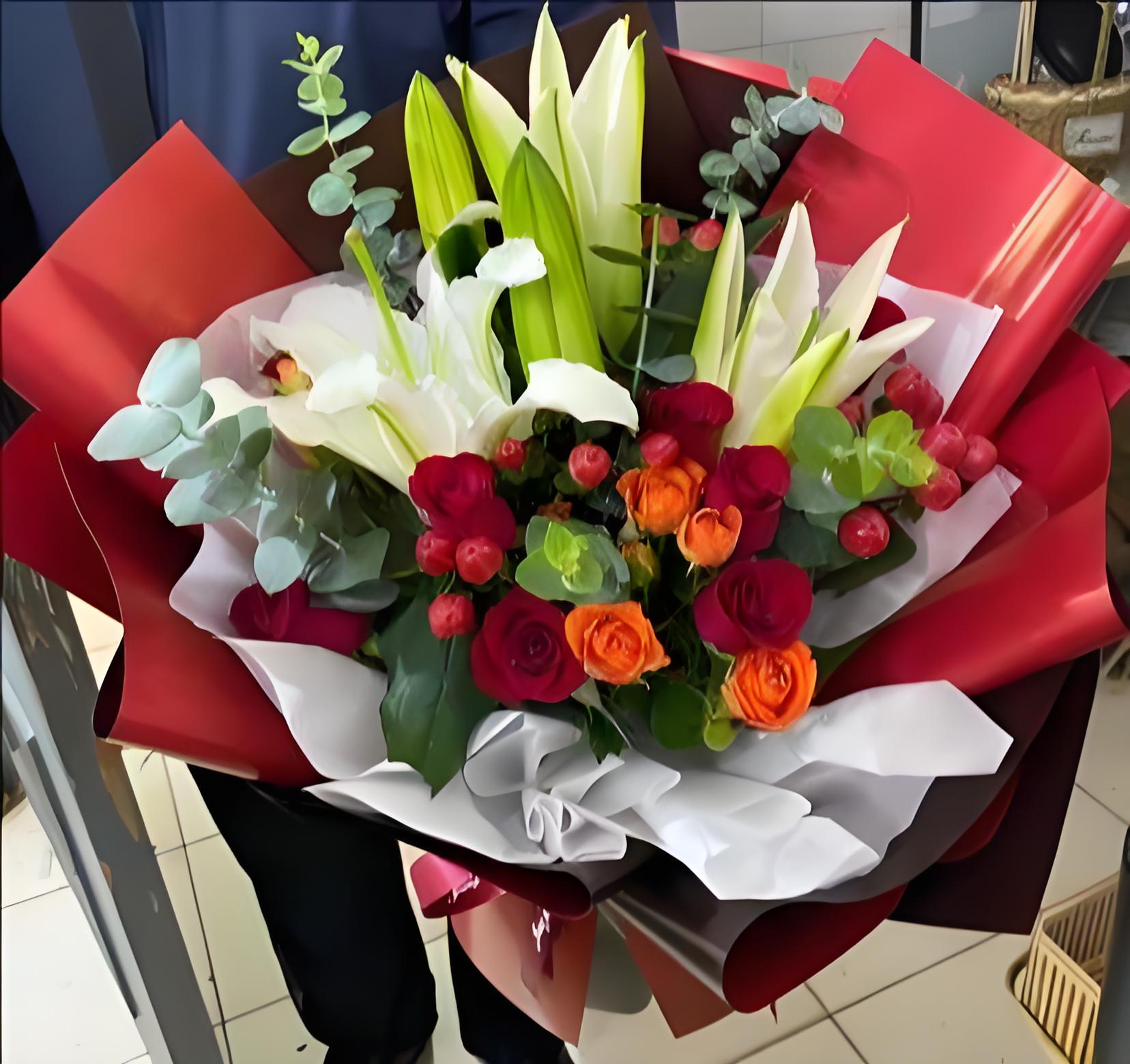 东莞企石镇花店包11枝红玫瑰、2枝多头白百合、6枝橙色多头玫瑰、红豆、尤加利叶